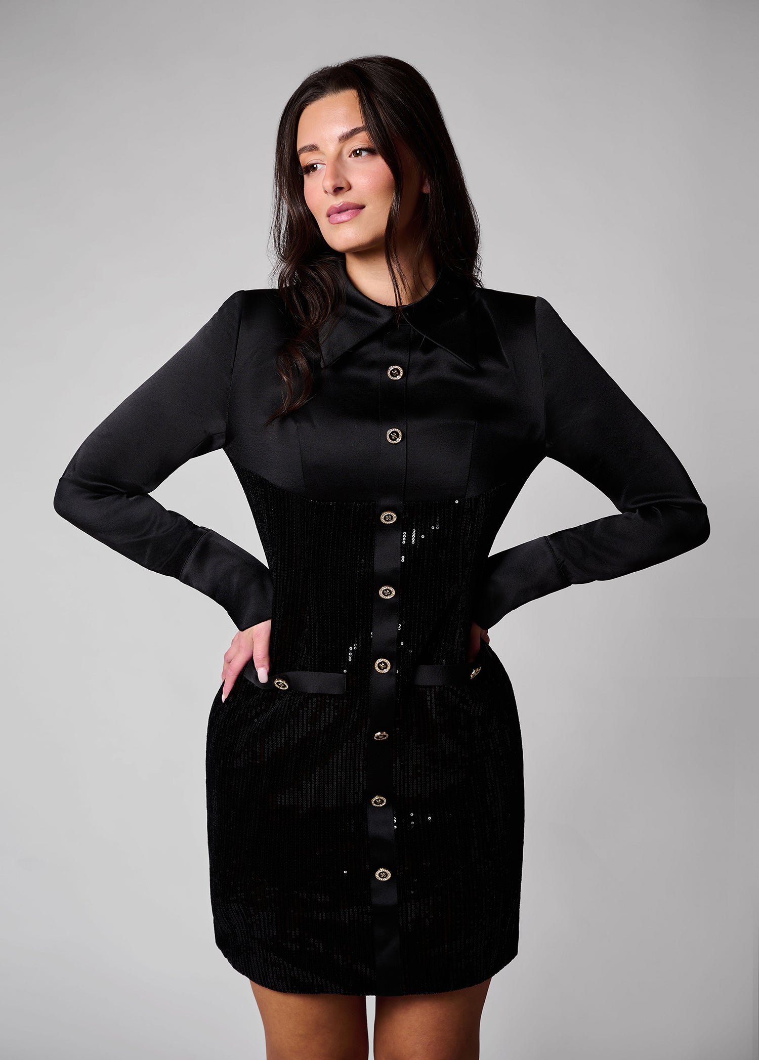 Ring in the New Year with this special dress! Delicate satin, bold sequins and fancy crystalized buttons, she's the lady of the party.