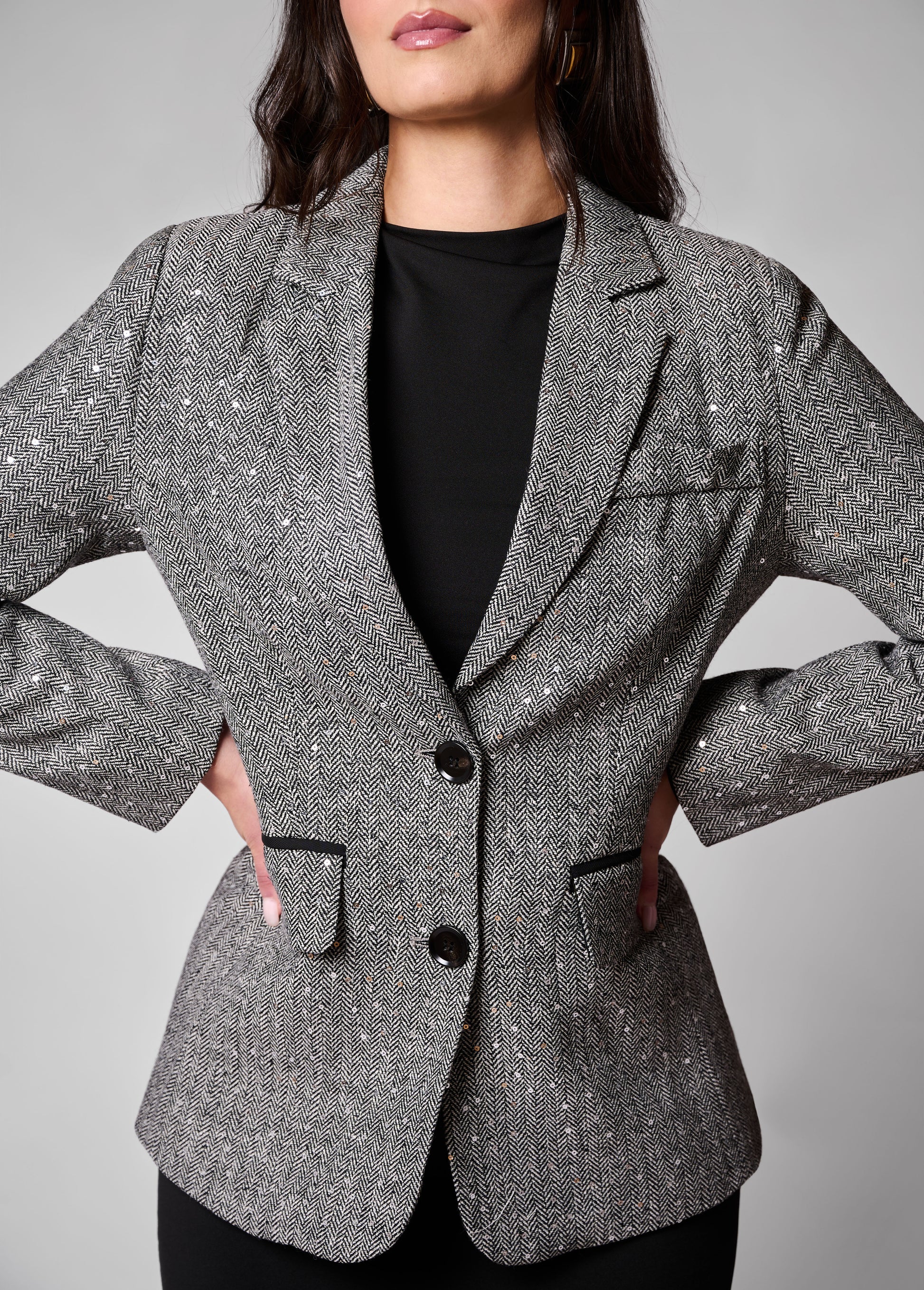 Elegant, timeless, with a touch of sparkle! The Elwyn single breasted and button blazer has a herringbone pattern, velvet elbow patch, constating piping, and sequins that may be subtle but pack a wow factor.