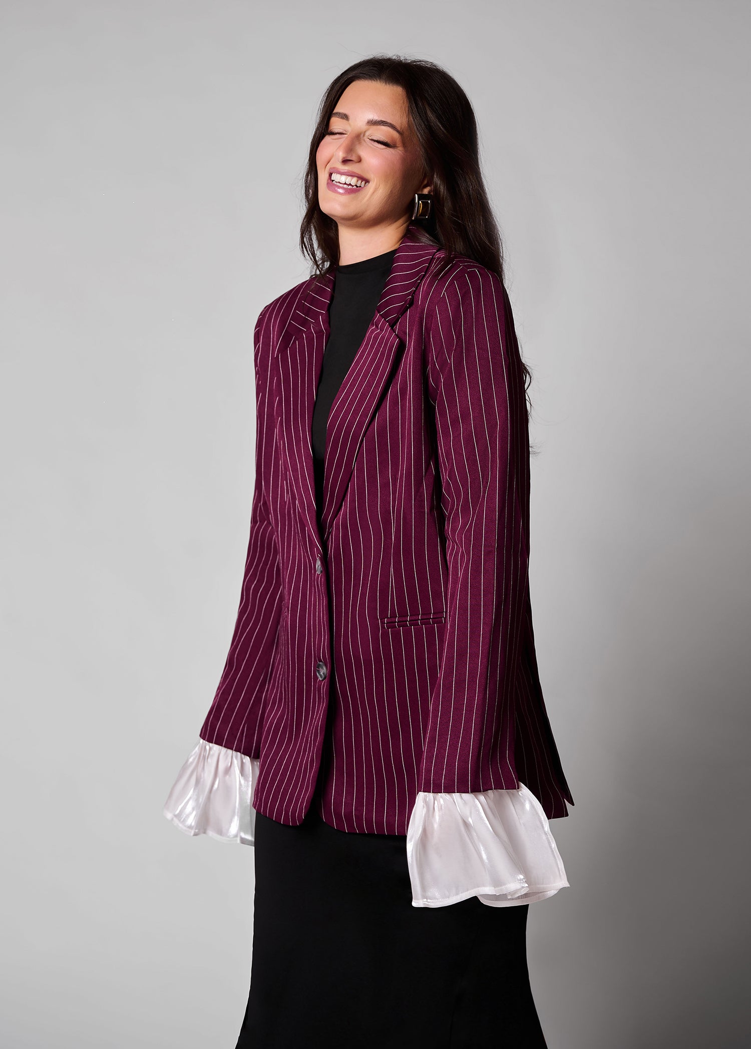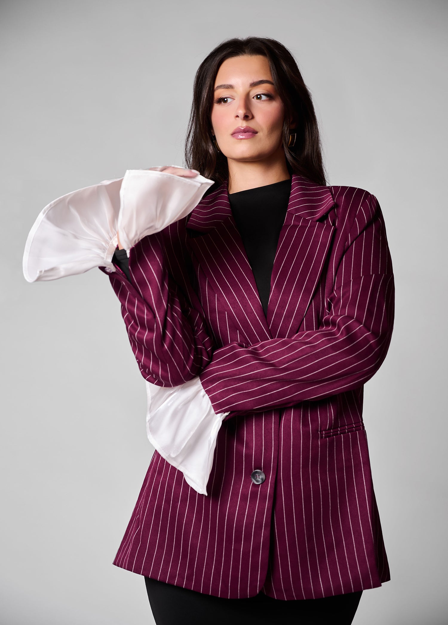 Versatile & unique, the Row blazer offers a special styling touch. With her deep hue, pinstriped detailing, oversized fit, and iridescent removable sleeve attachments, she's a special blazer for the winter.