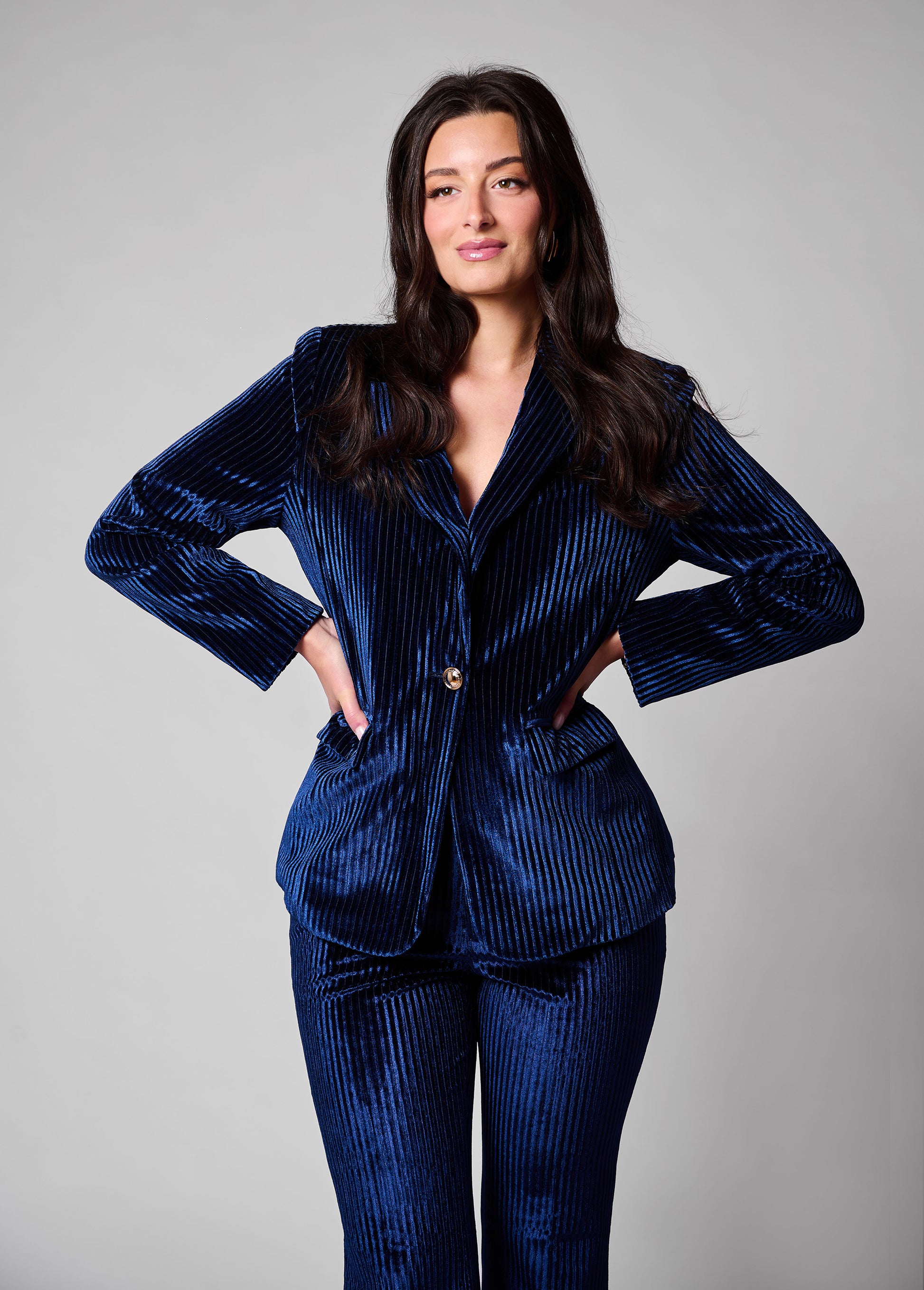 The gaze-turning Sterling suit is made up of a single breasted blazer with fancy light champagne buttons and a straight leg pant. A showstopper for festive gatherings!